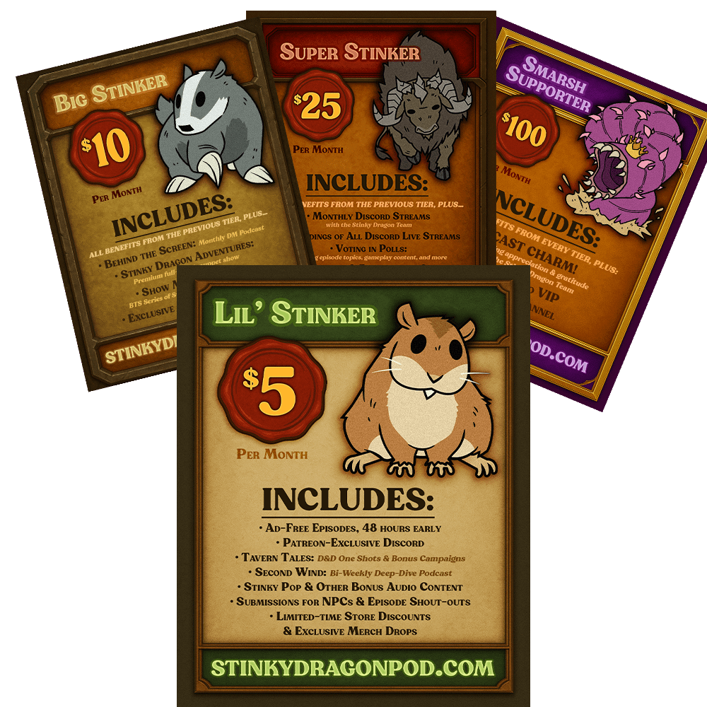 Your direct support helps Tales from the Stinky Dragon keep making quality D&D content and allows us to grow as an independent company.